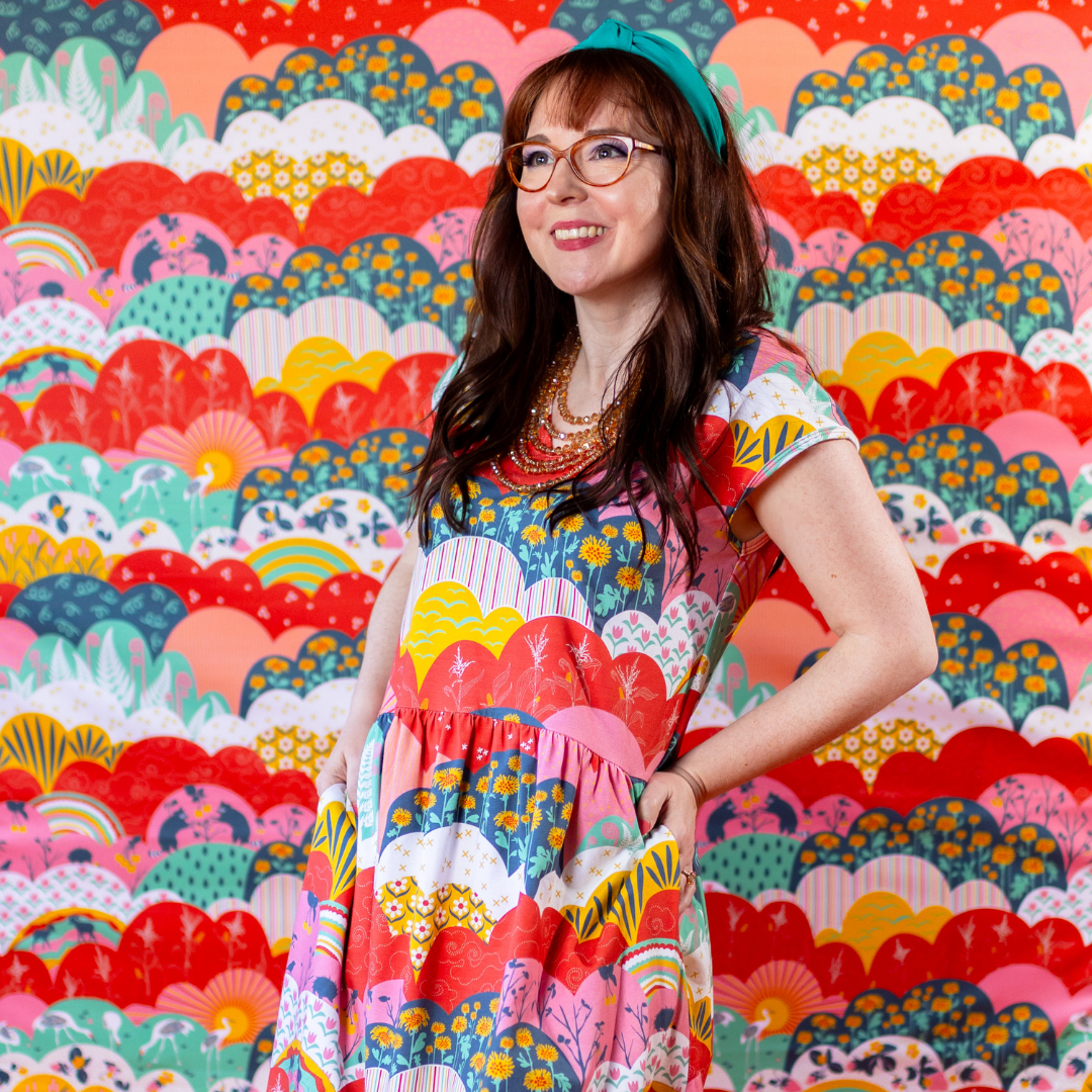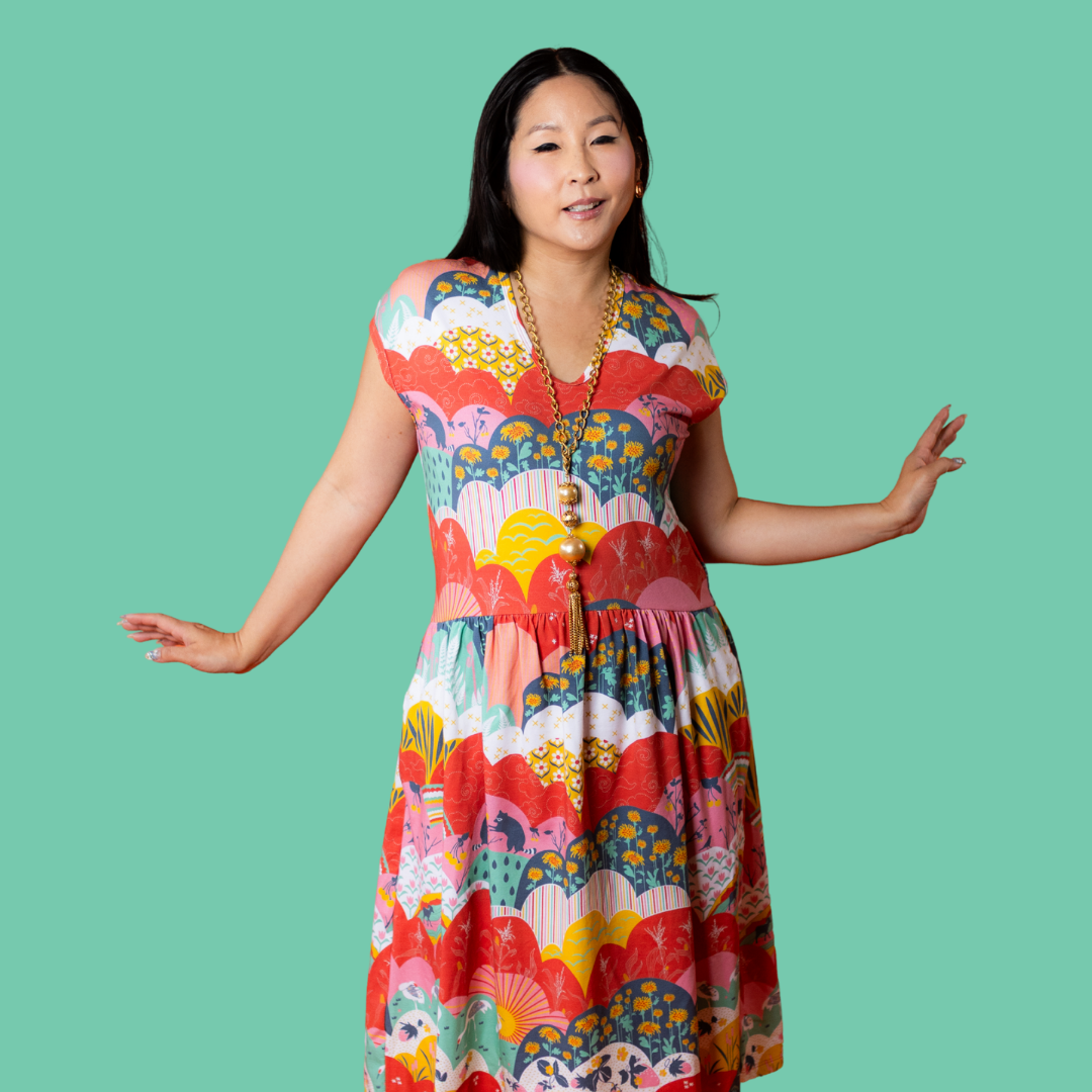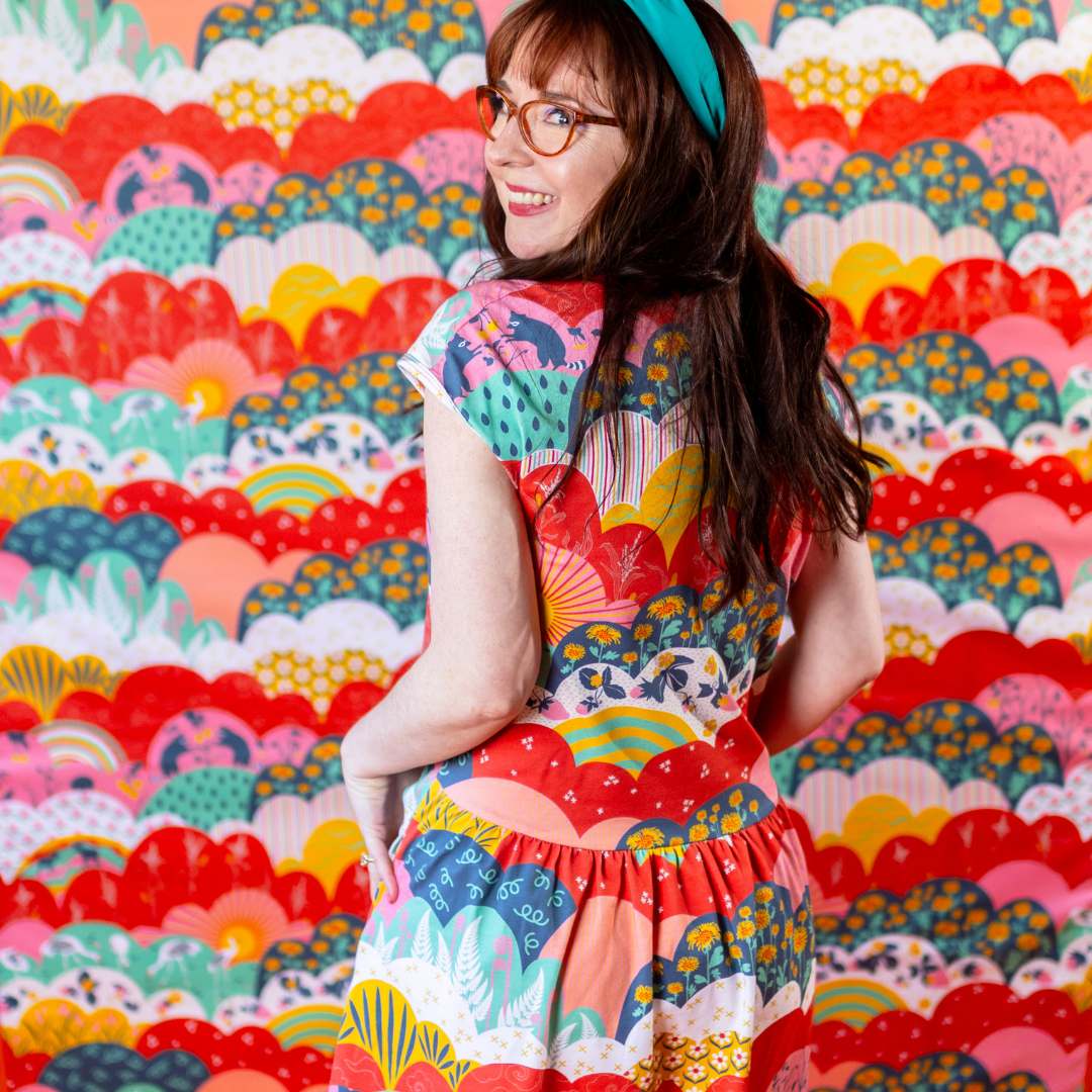 This lovely midi dress features our intriguing new meadow print full of raccoons, cranes, strawberries, corn stalks and more! The fabric is very soft & stretchy and this promises to be your most comfortable day to day frock!