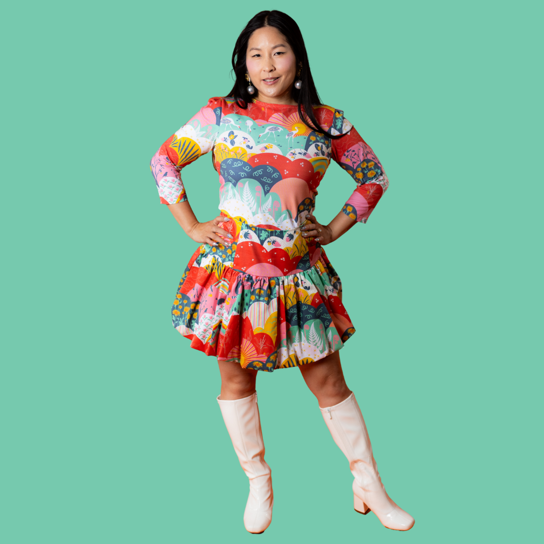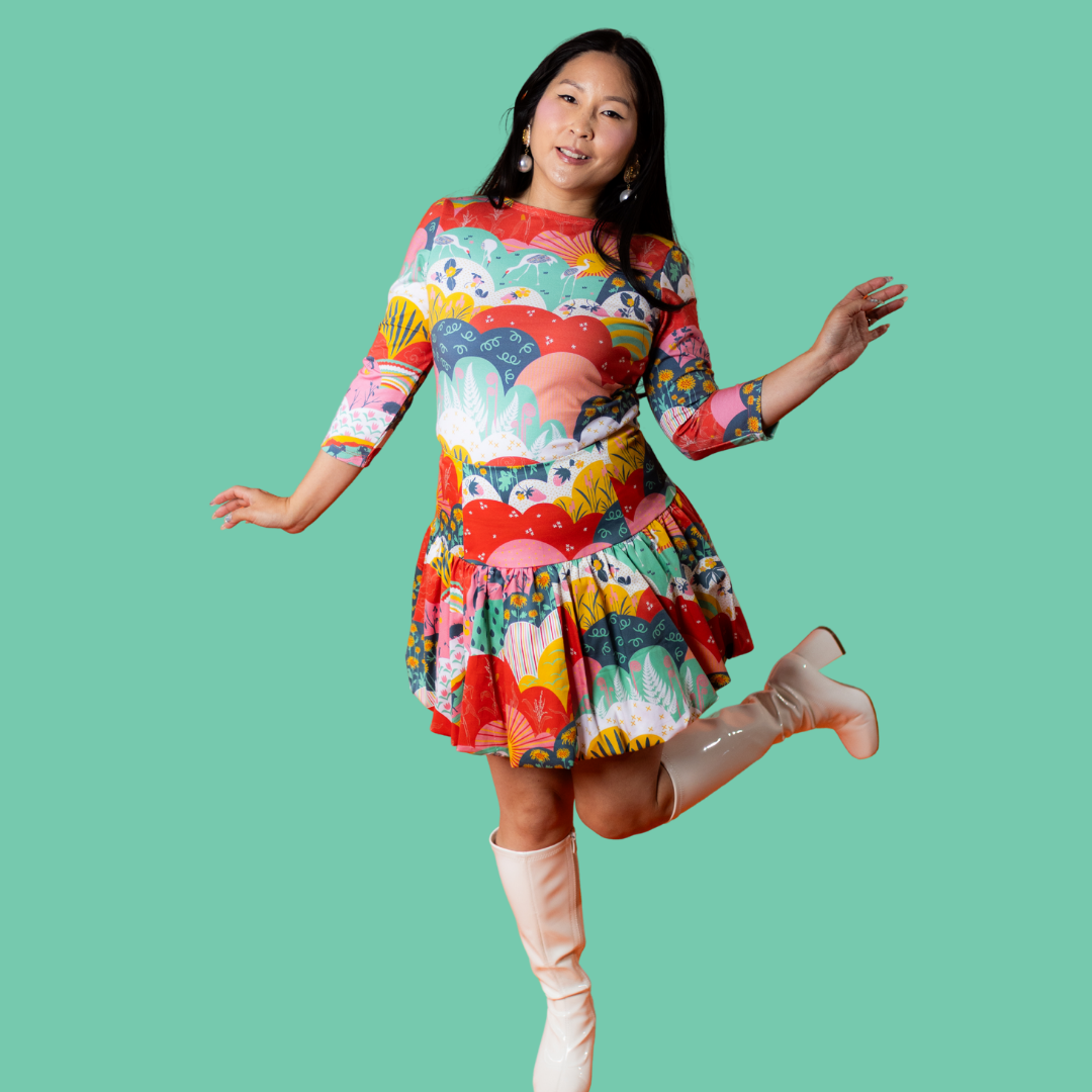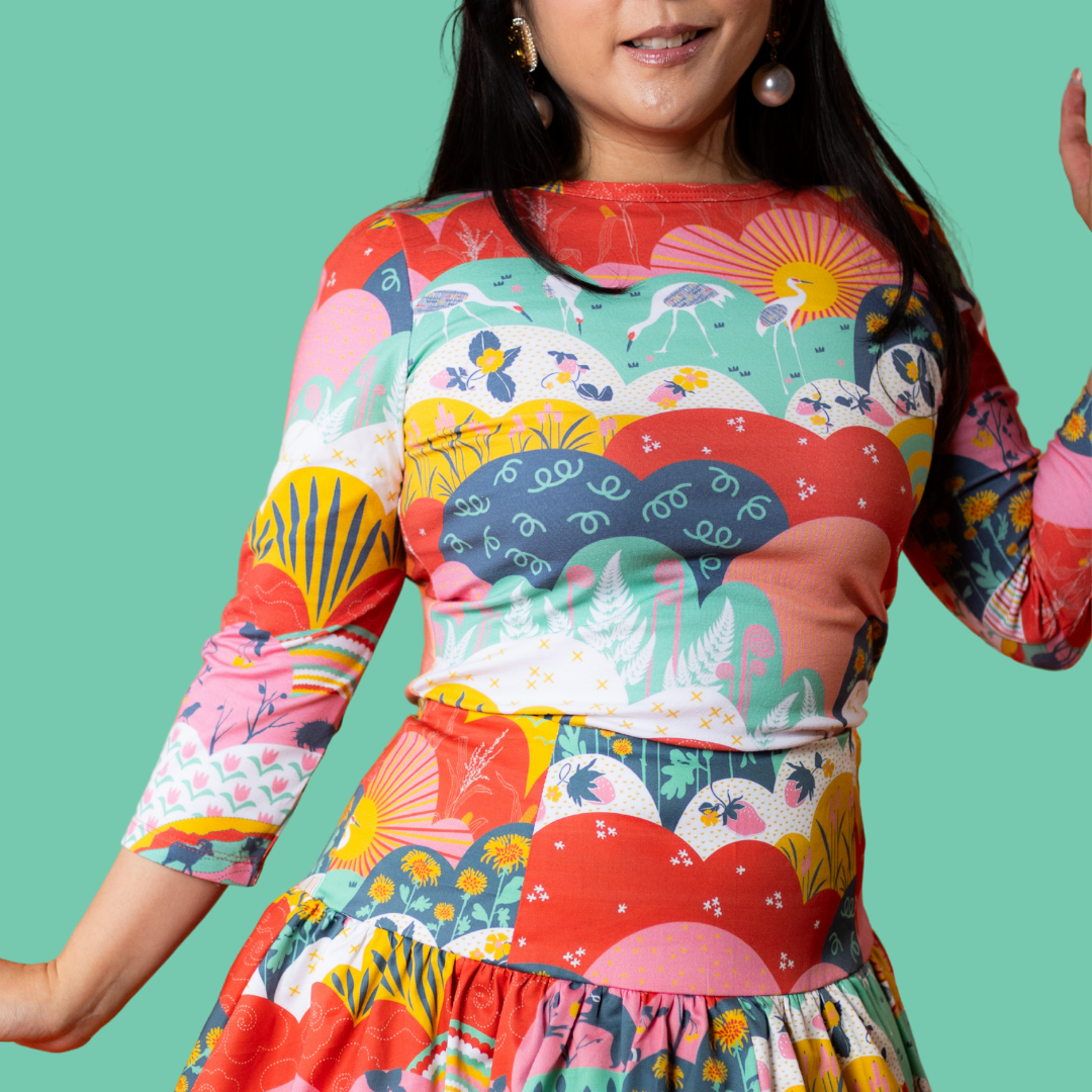 This gorgeous & versatile cotton tee features our brand new meadow print in happy colors on our bestselling 3/4 tee body for XS-4X! Note the raccoons, sandhill cranes, strawberries and corn stalks in this fun print!