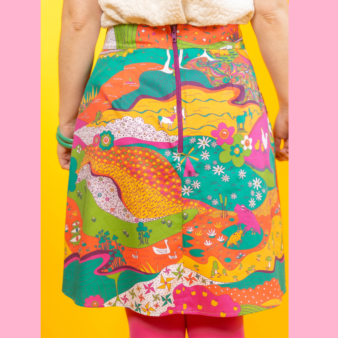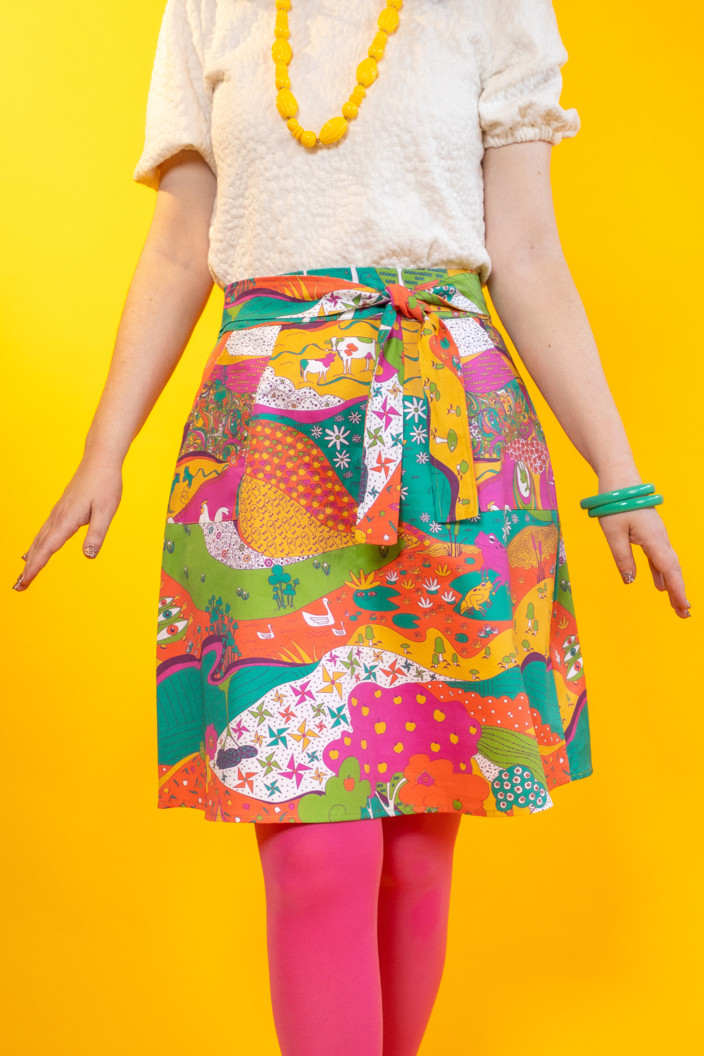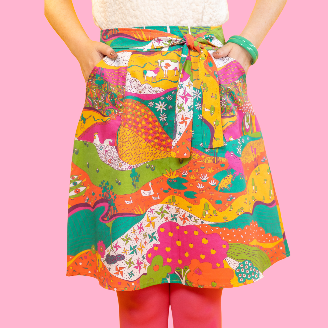 The woven skirt from Blue Platypus features this vintage-inspired landscape print in a palette of gorgeous bold colors! This one features front patch pockets, the perfect just above knee length, and a tie that can be tied in front or back. The color scheme and print are top sellers, in the most flattering a-line silhouette!
