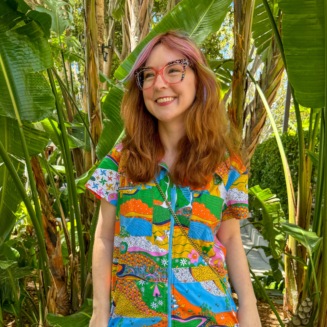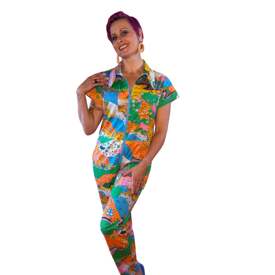 This incredible jumpsuit features our original 70s-inspired landscape print bursting with animals, trees, and bright colors in ALL 9 SIZES in a BRAND NEW shape and gorgeous bright palette!