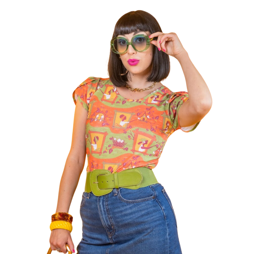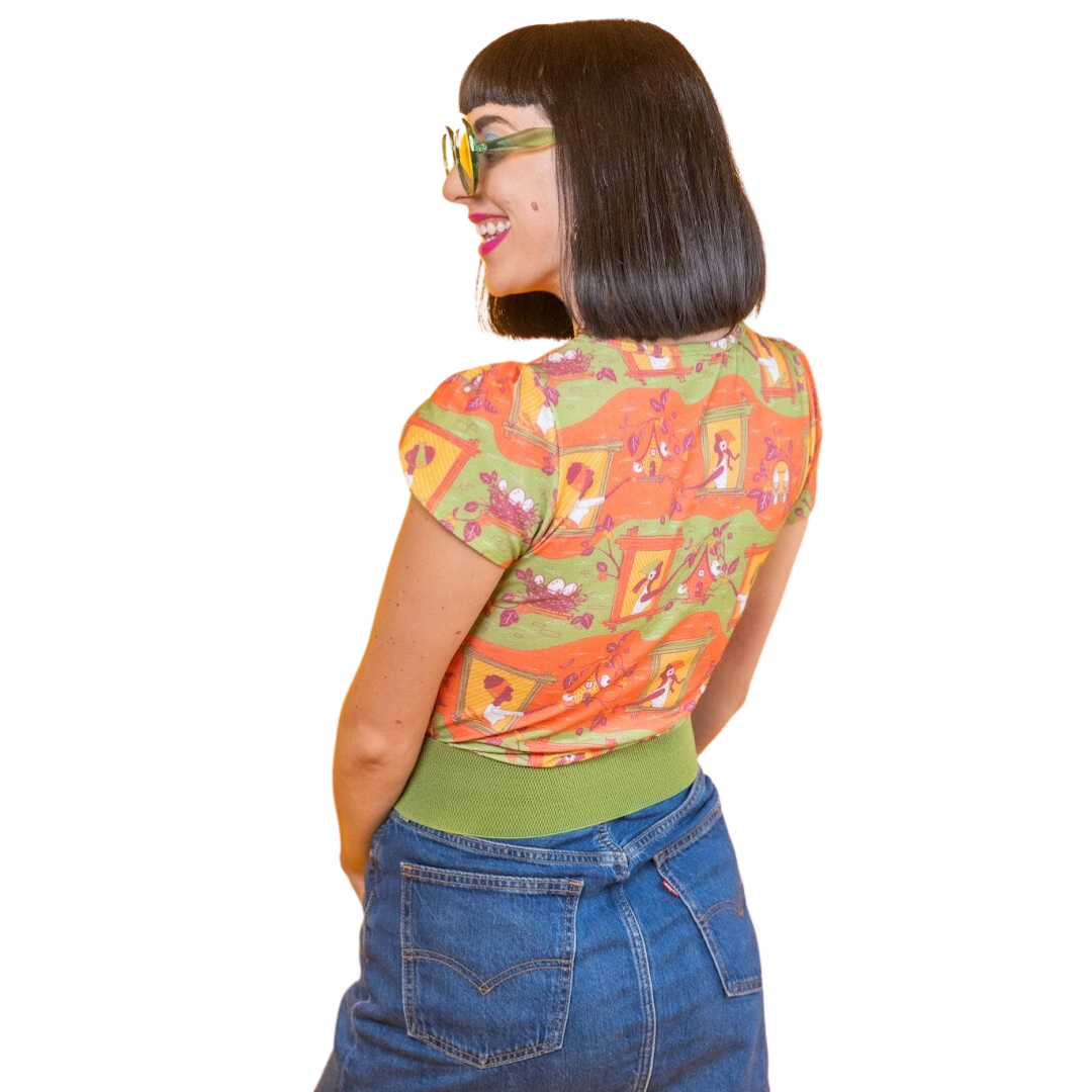 We are excited to introduce our original print of girls in silhouetted in their windows, surrounded by fruit vines and birds. Sort of an urban fairy tale for all the dreamers, this is sure to become a staple of your closet! This gorgeous & versatile cotton tee features our darling vintage-inspired print in ALL 9 SIZES in your favorite tulip-sleeved tee silhouette!