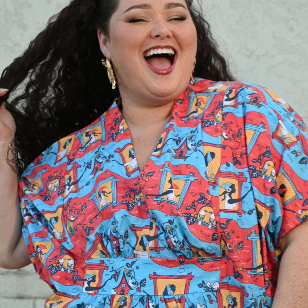 We just love this original print of girls in silhouetted in their windows, surrounded by fruit vines and birds. Sort of an urban fairy tale for all the dreamers, this is sure to become a staple of your closet! This caftan is a light and breezy, washable cotton with an adjustable waist (there's a hidden ribbon for tying inside). She comes in 2 sizes, one which should fit XS-XL and one to fit plus size 1X-4X. Best of all, there are 2 patch pockets for storing all your treasures while you float around in a beautiful cloud of fabric!