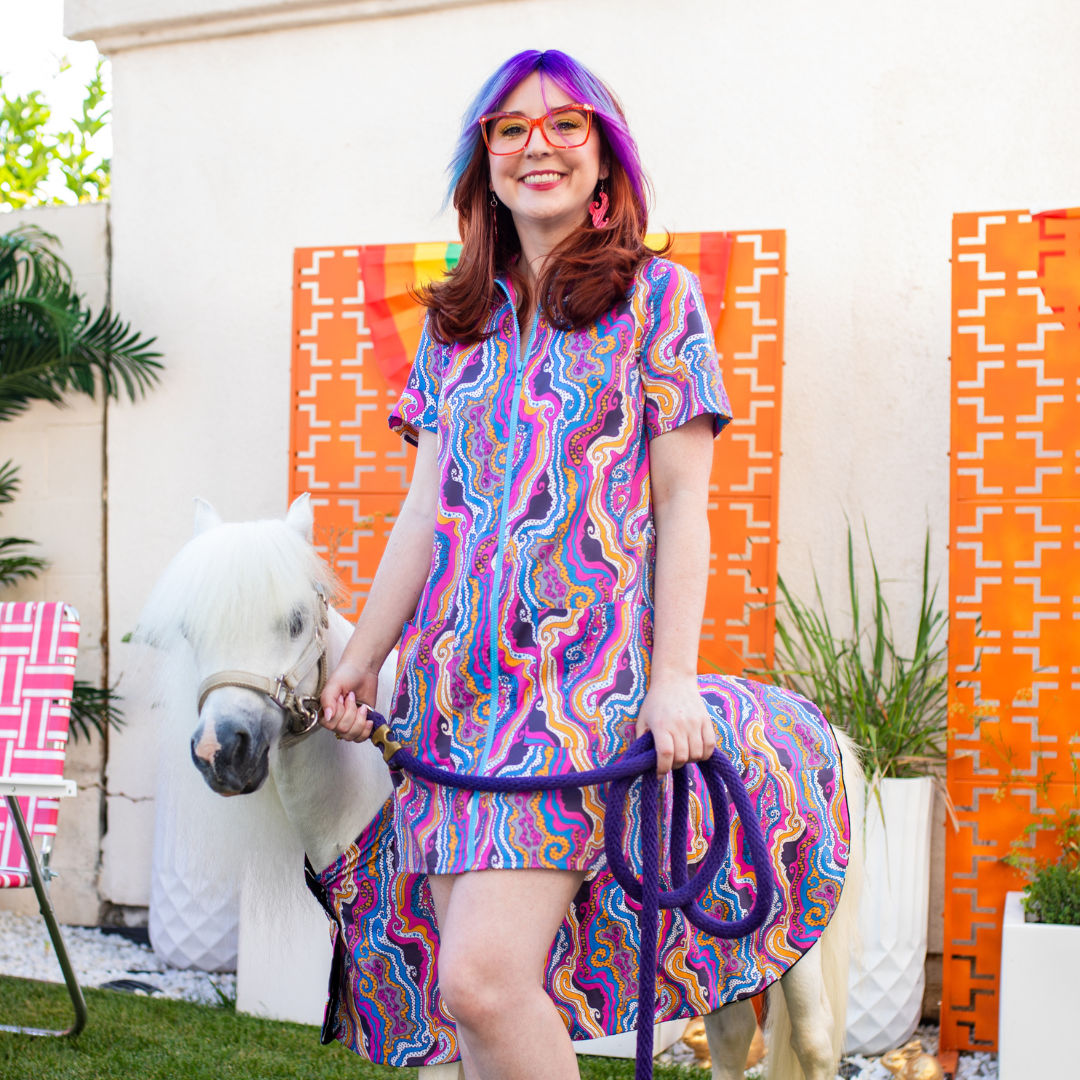 This incredible frock features our fabulous psychedelic print in gorgeous purples and gold! She features a rounded collar, a big exposed zipper and pockets in our darling print of swirls, silhouette heads and even tiny platypuses and eggs. This gorgeous & versatile cotton mini features our original fantastical print in ALL 9 SIZES!