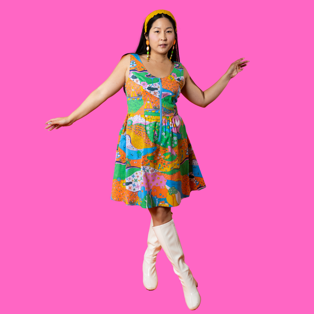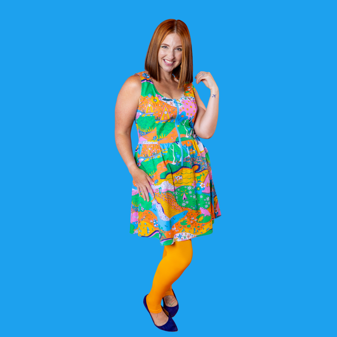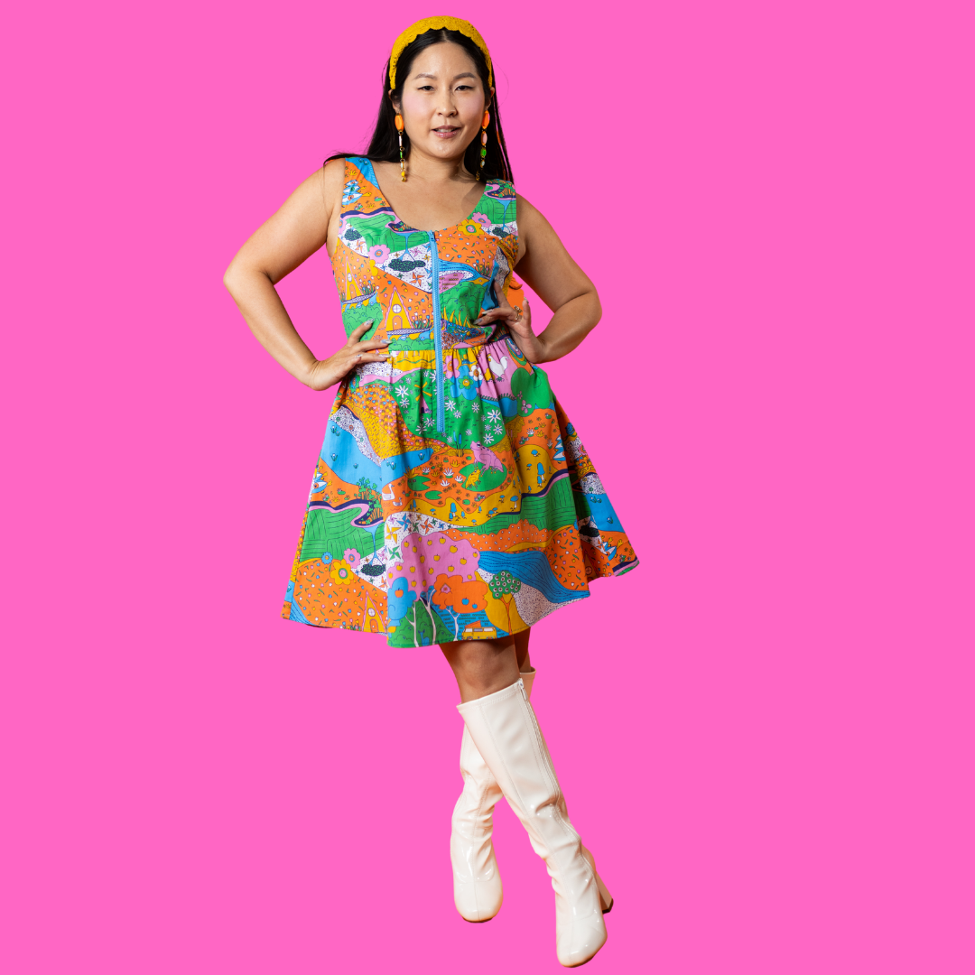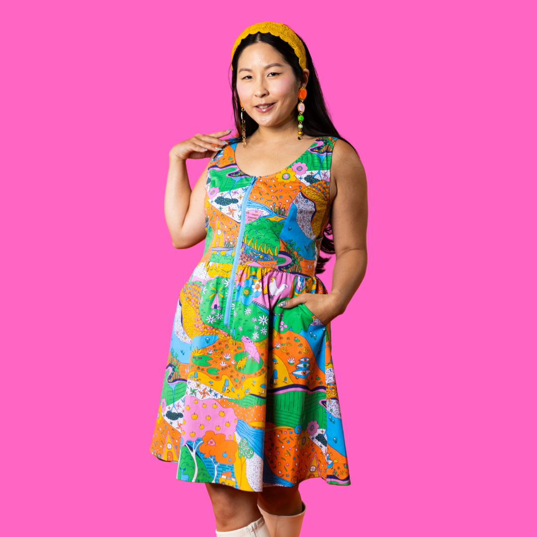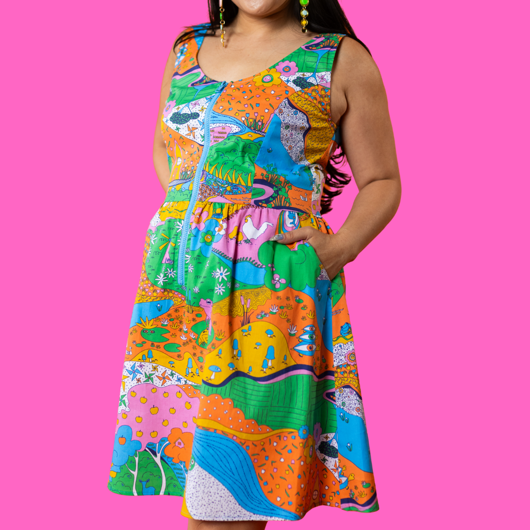 Here's an adorable woven dress, made of stretch cotton poplin!  Featuring our original, quirky '70s-inspired landscape print of chickens, turtles, apple trees, goats and more!  It's a cornucopia of color and fun! These scoop neck dresses feature a bright front zip, POCKETS, and a neckline that looks flattering on all body types and isn't too revealing for work or too boring for a date!  Note- zip matches the blue from the print, is not the green from pic.