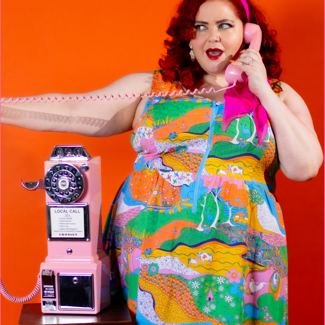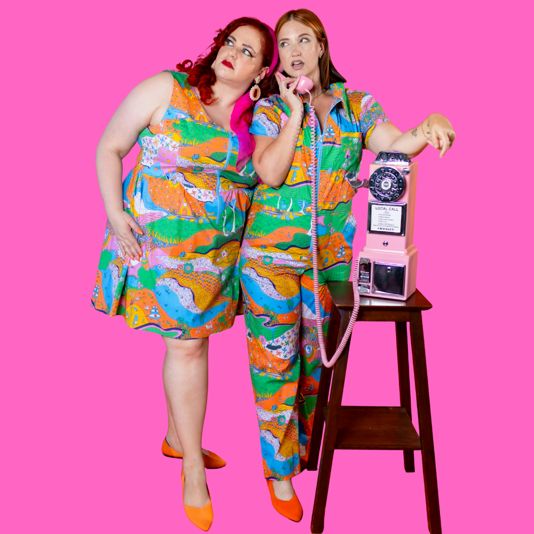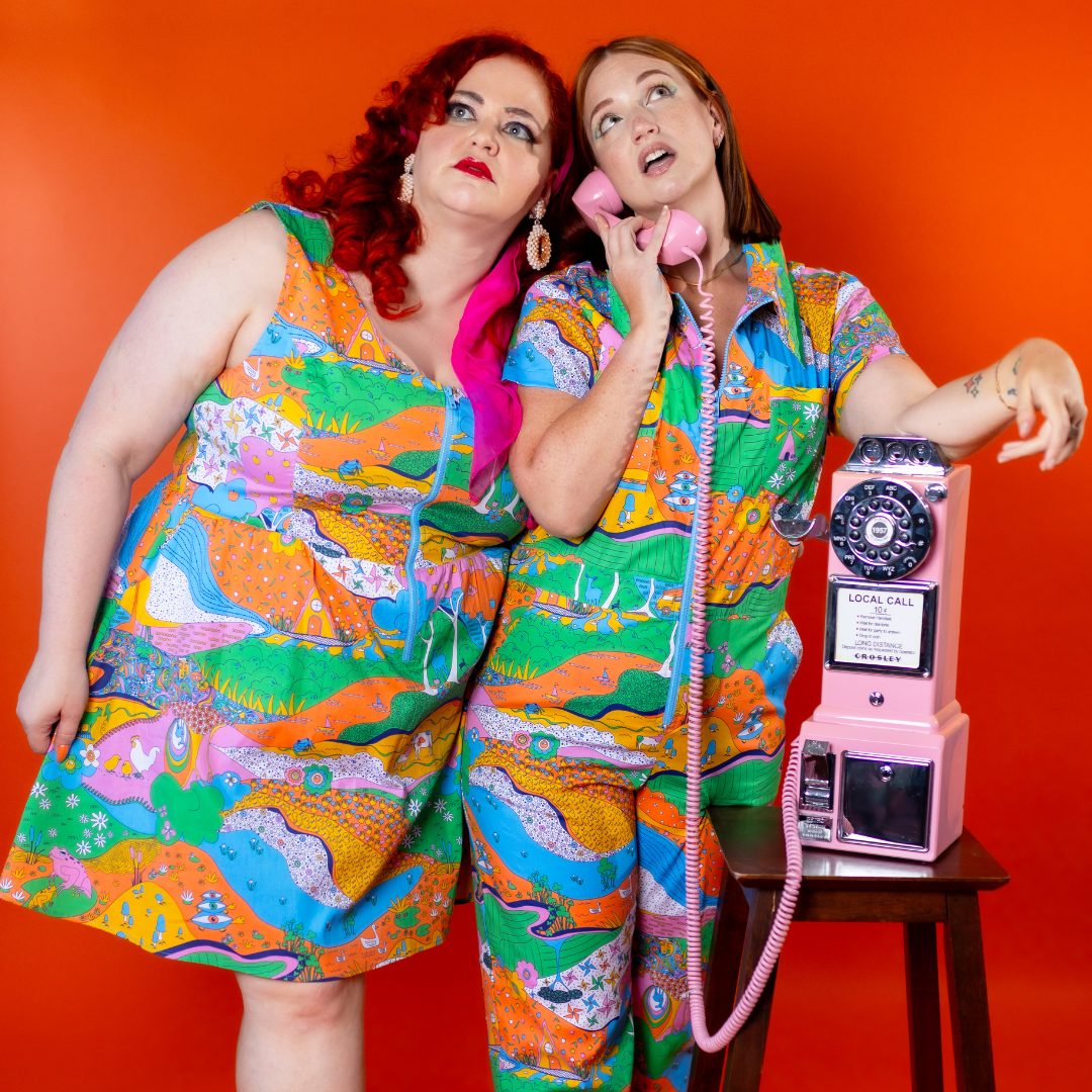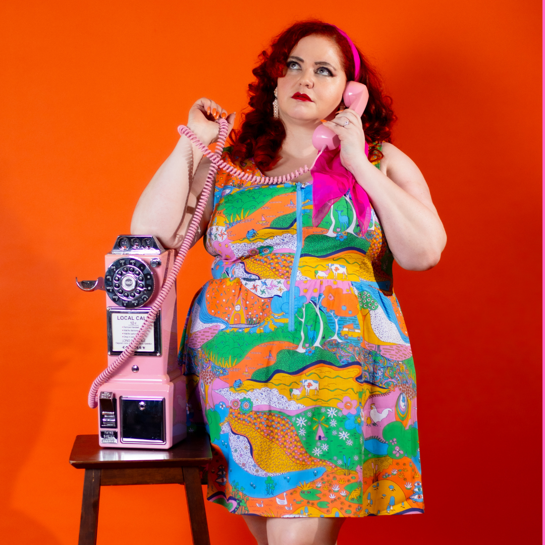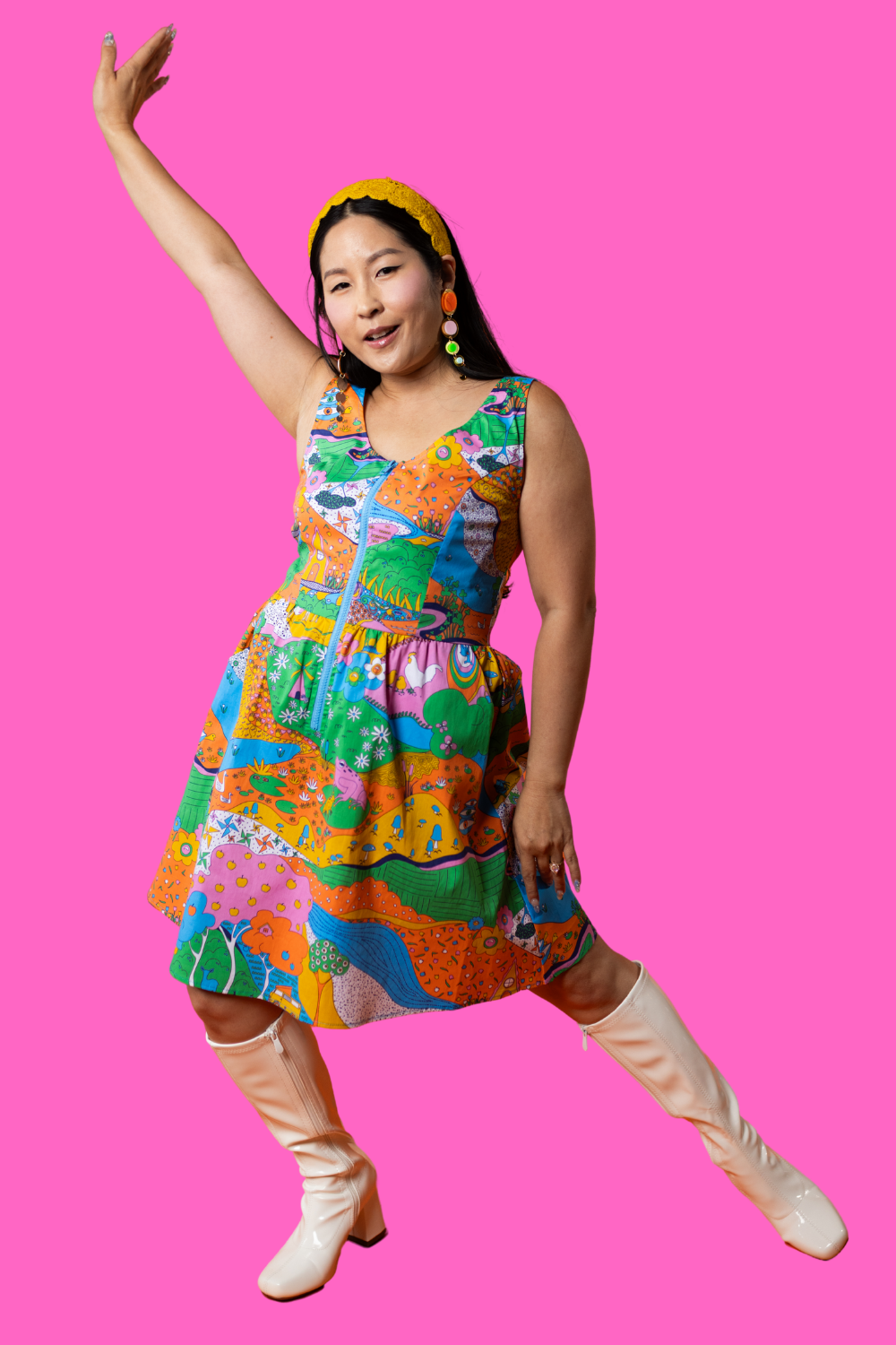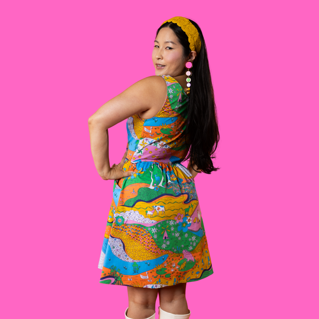 Here's an adorable woven dress, made of stretch cotton poplin!  Featuring our original, quirky '70s-inspired landscape print of chickens, turtles, apple trees, goats and more!  It's a cornucopia of color and fun! These scoop neck dresses feature a bright front zip, POCKETS, and a neckline that looks flattering on all body types and isn't too revealing for work or too boring for a date!  Note- zip matches the blue from the print, is not the green from pic.
