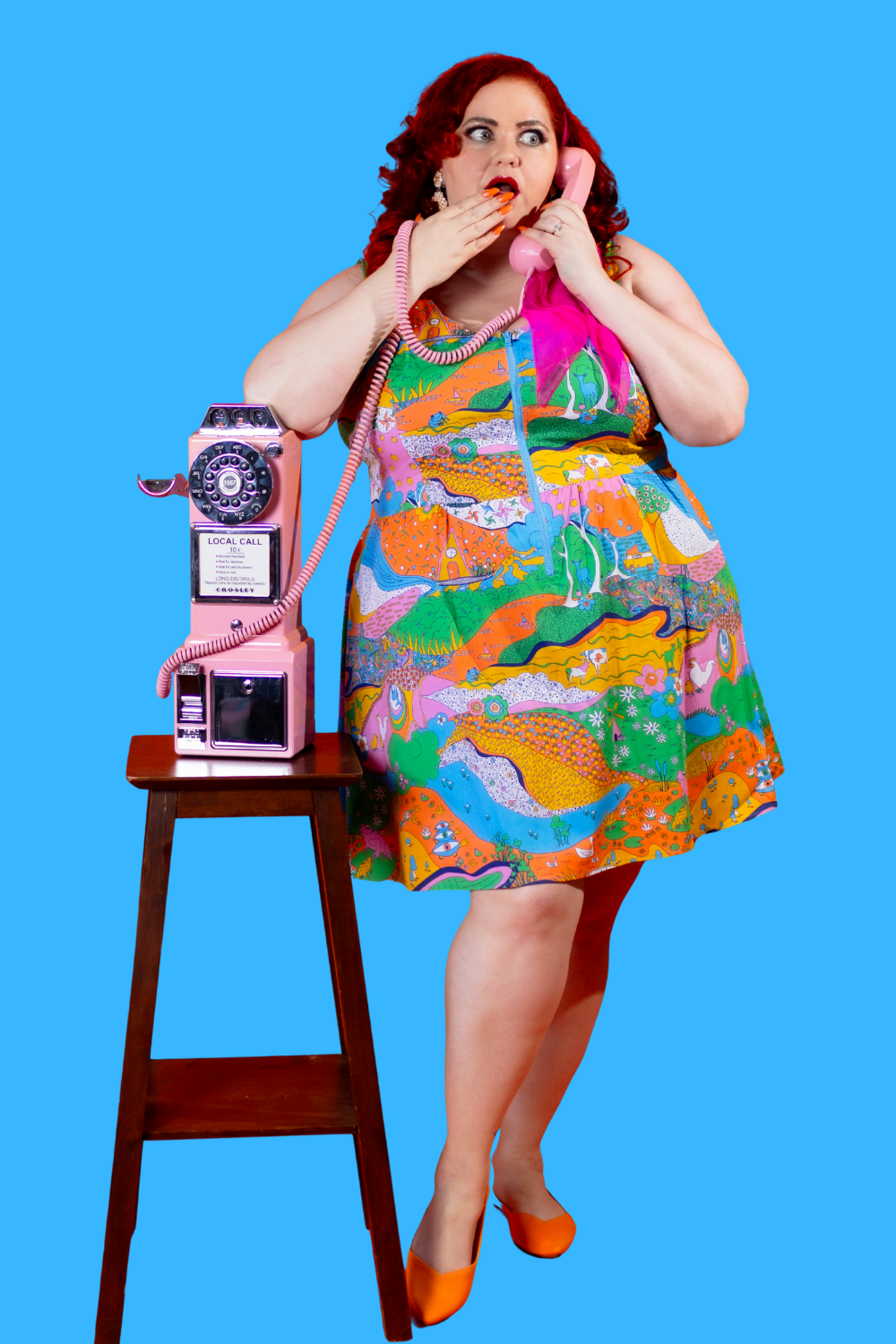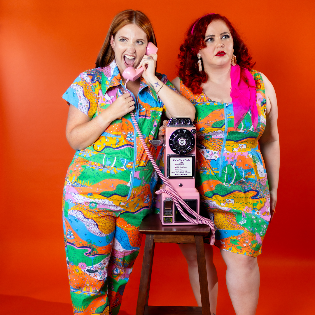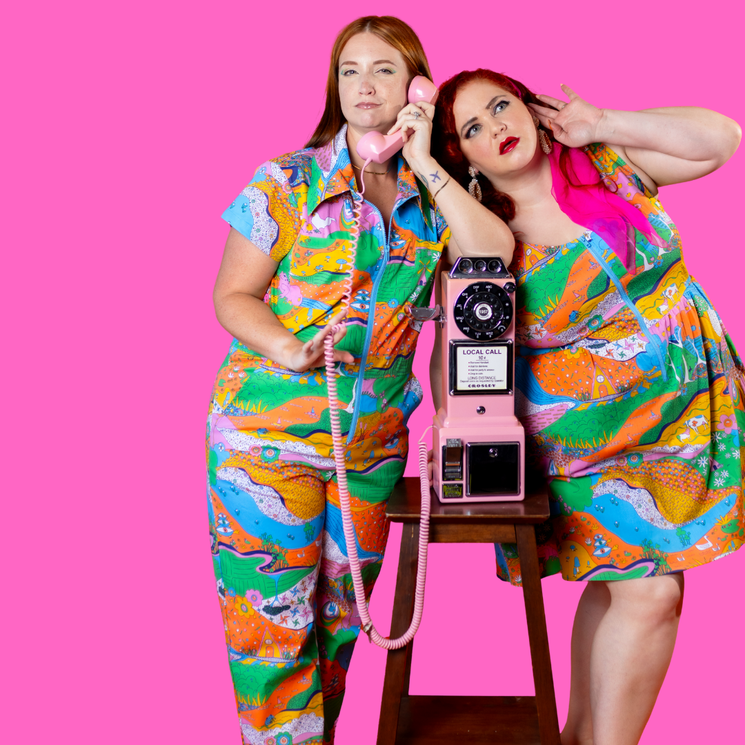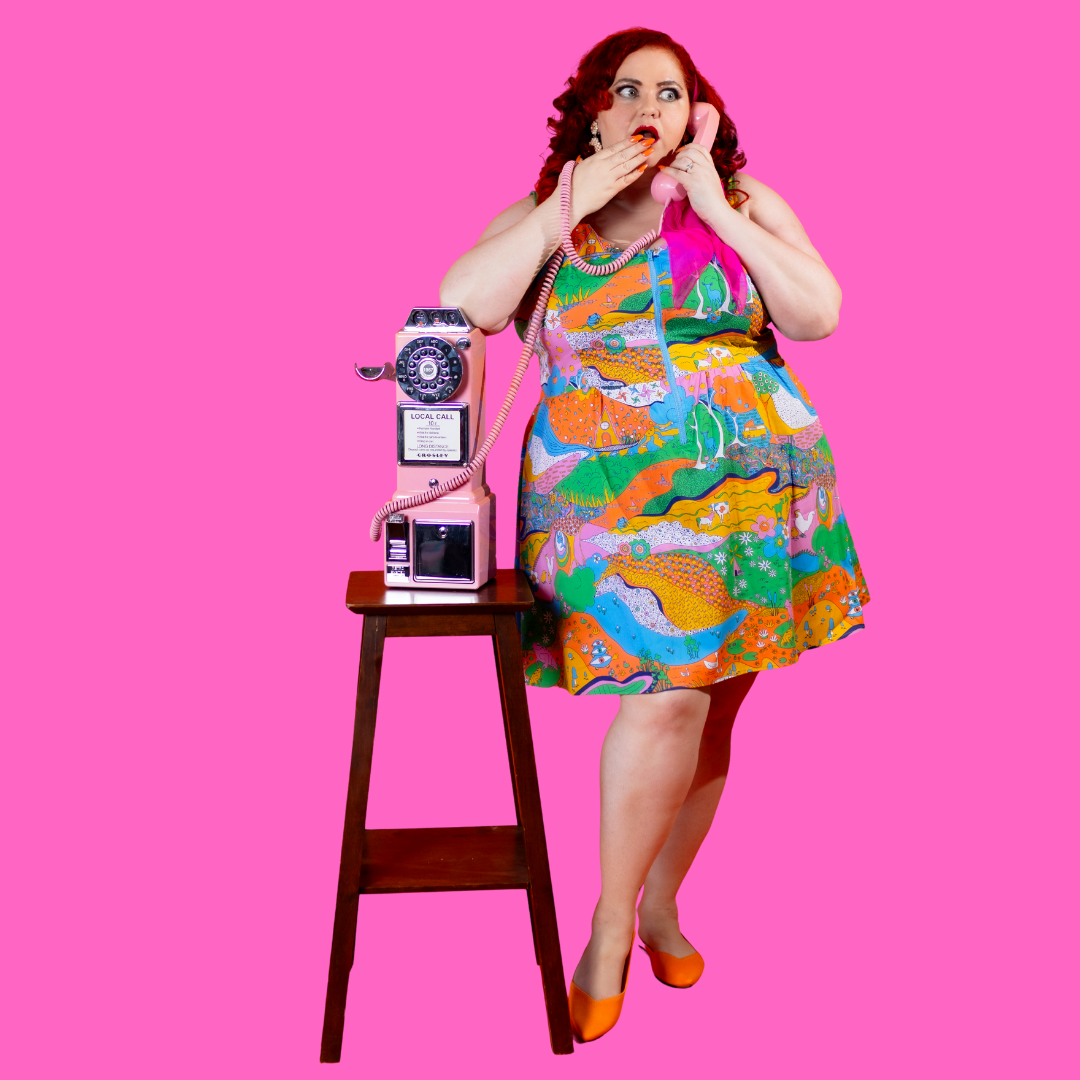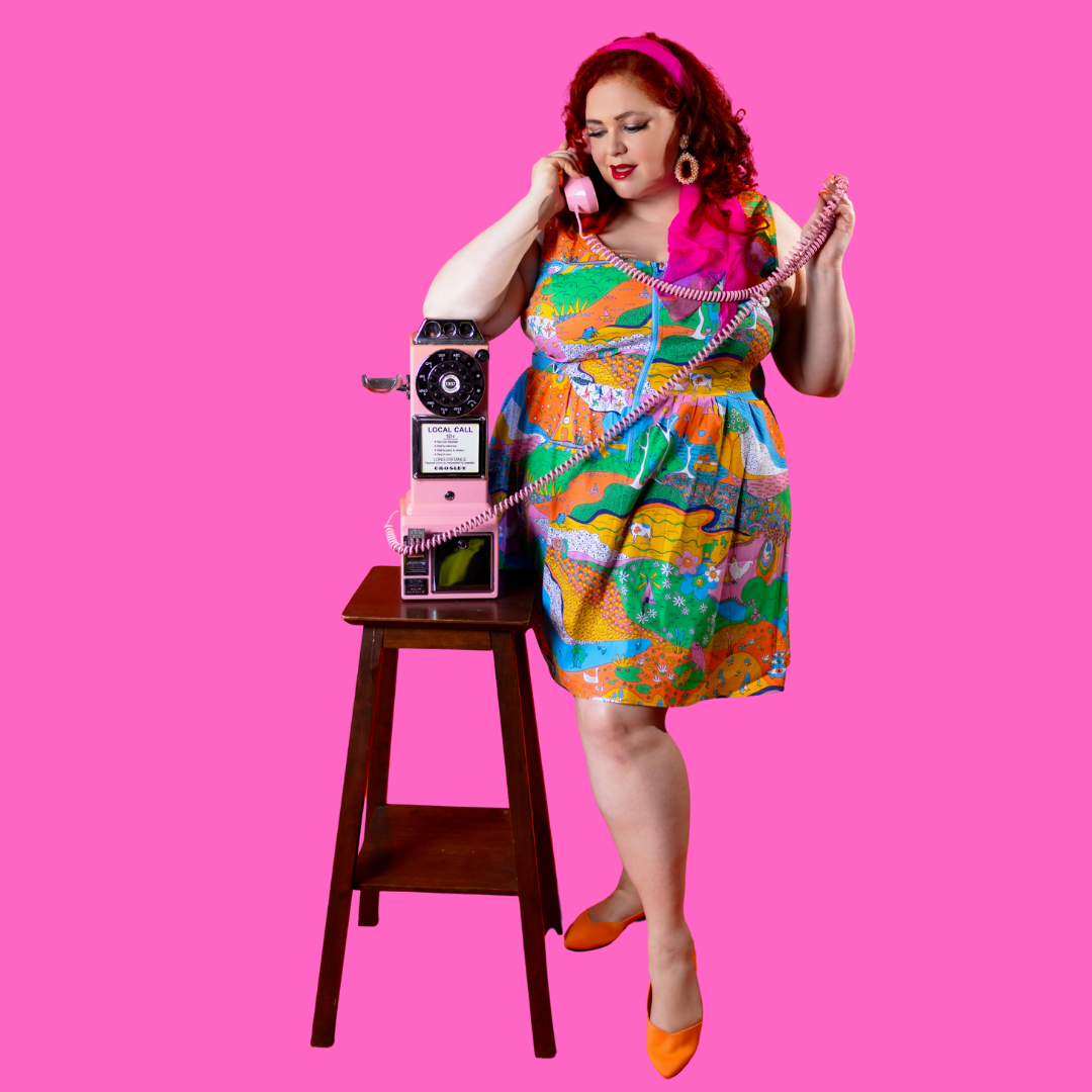 Here's an adorable woven dress, made of stretch cotton poplin!  Featuring our original, quirky '70s-inspired landscape print of chickens, turtles, apple trees, goats and more!  It's a cornucopia of color and fun! These scoop neck dresses feature a bright front zip, POCKETS, and a neckline that looks flattering on all body types and isn't too revealing for work or too boring for a date!  Note- zip matches the blue from the print, is not the green from pic.