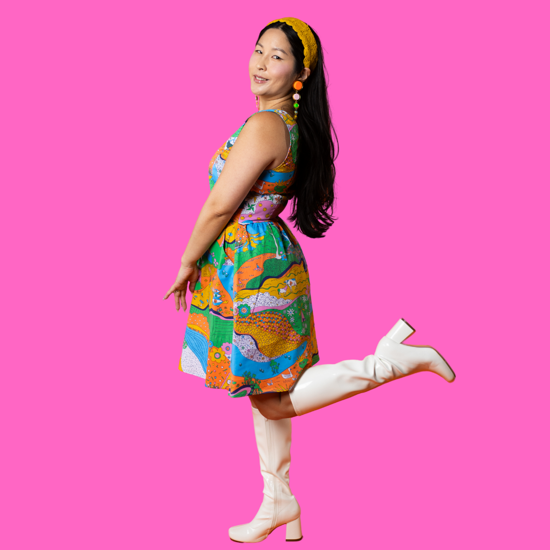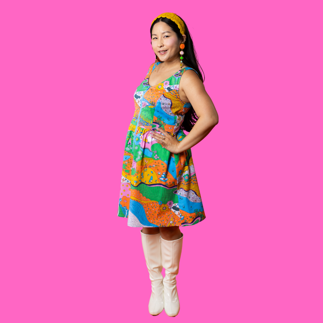 Landscape Print Fit & Flare Midi Dress in Rainbow Farm- Re-Stocked!