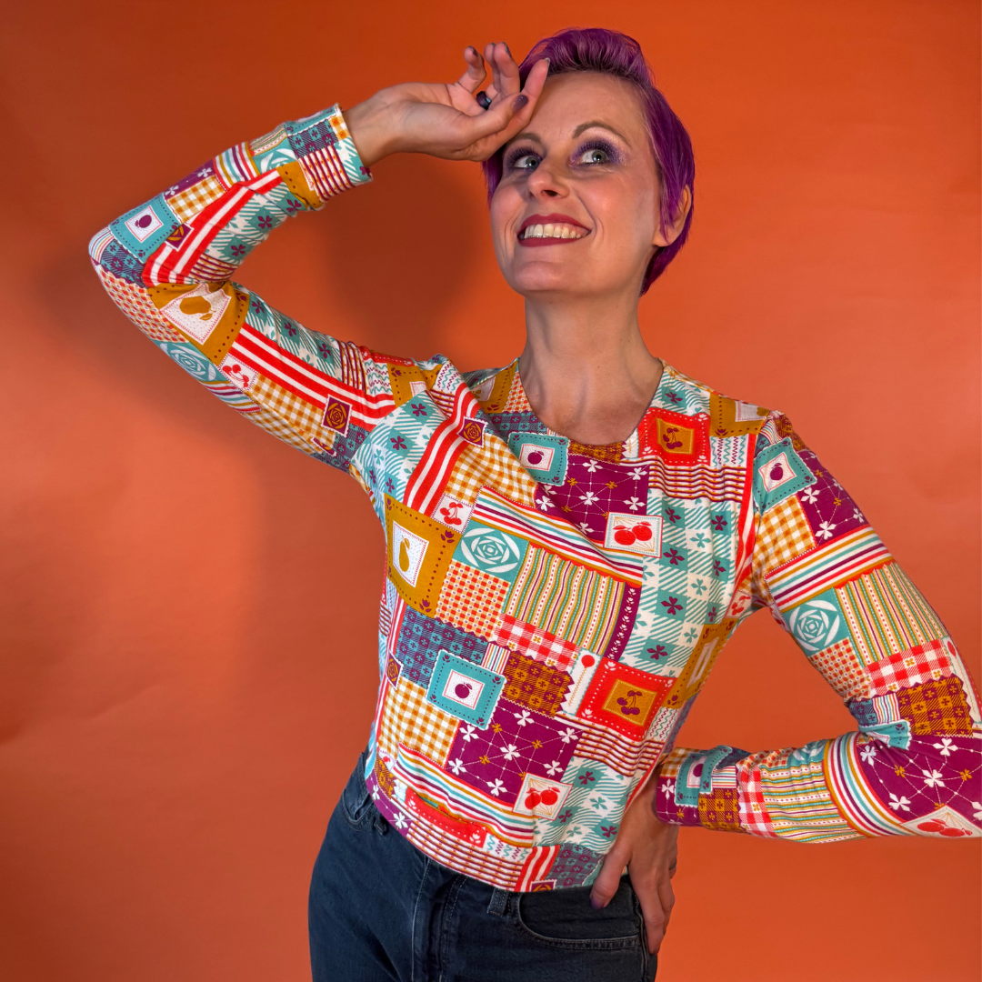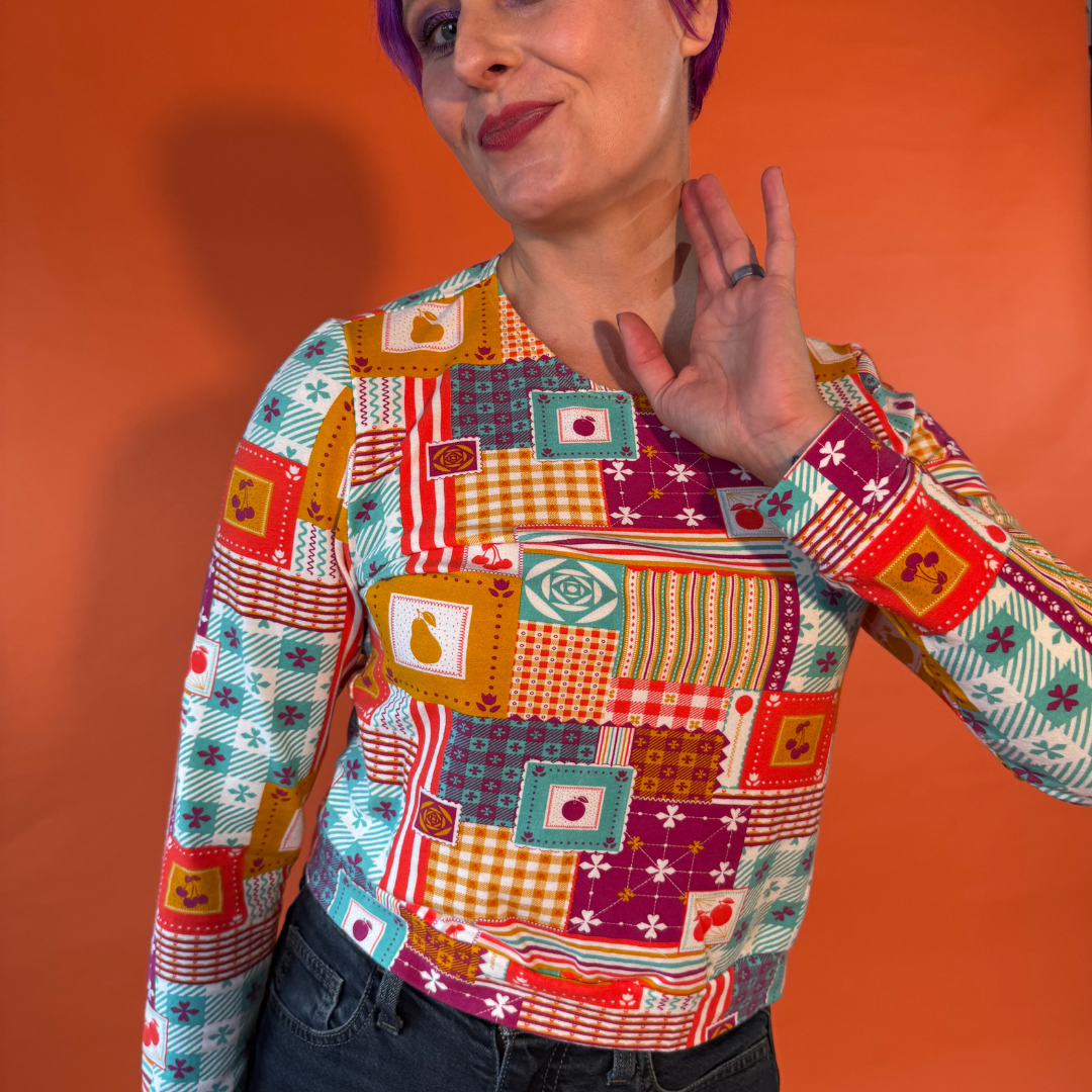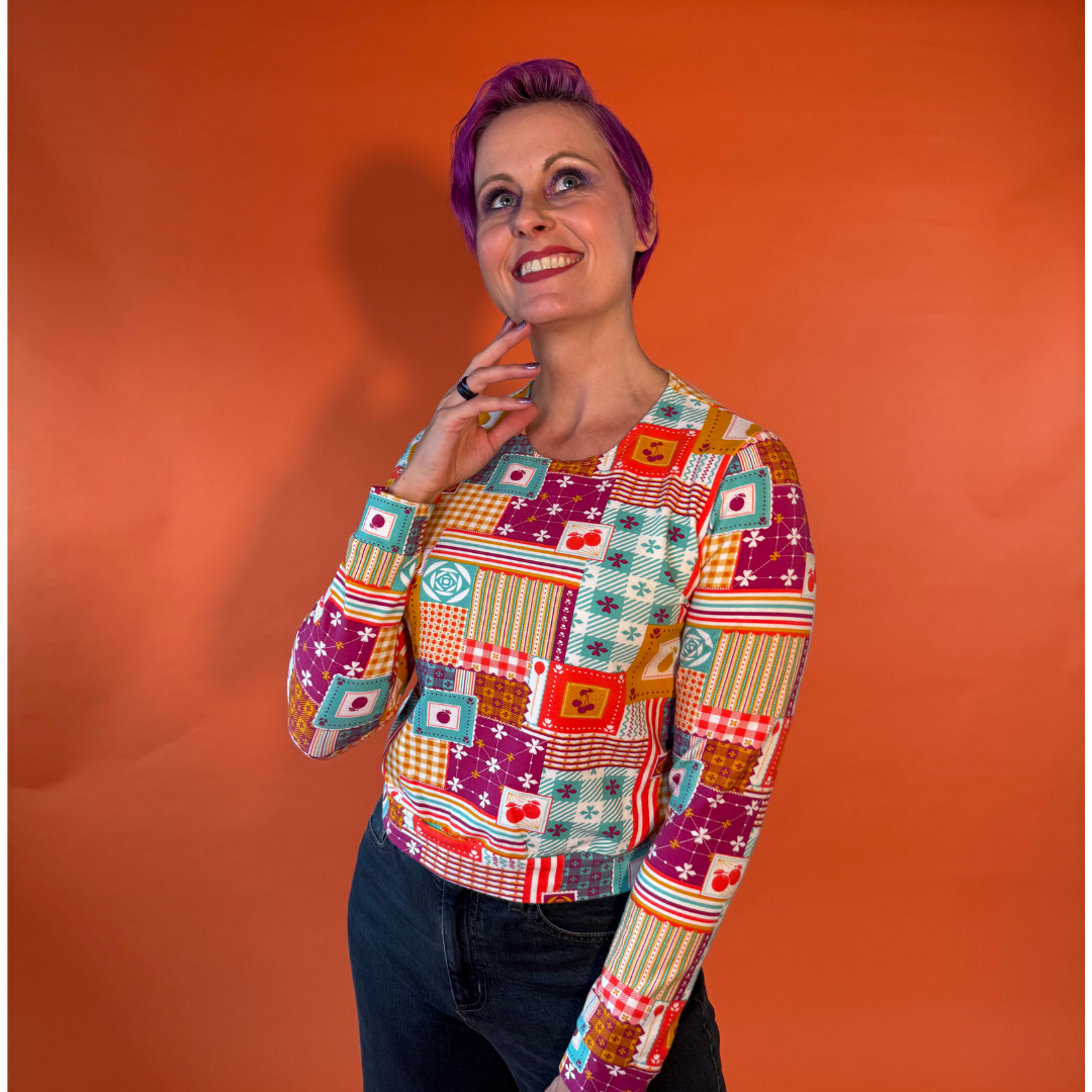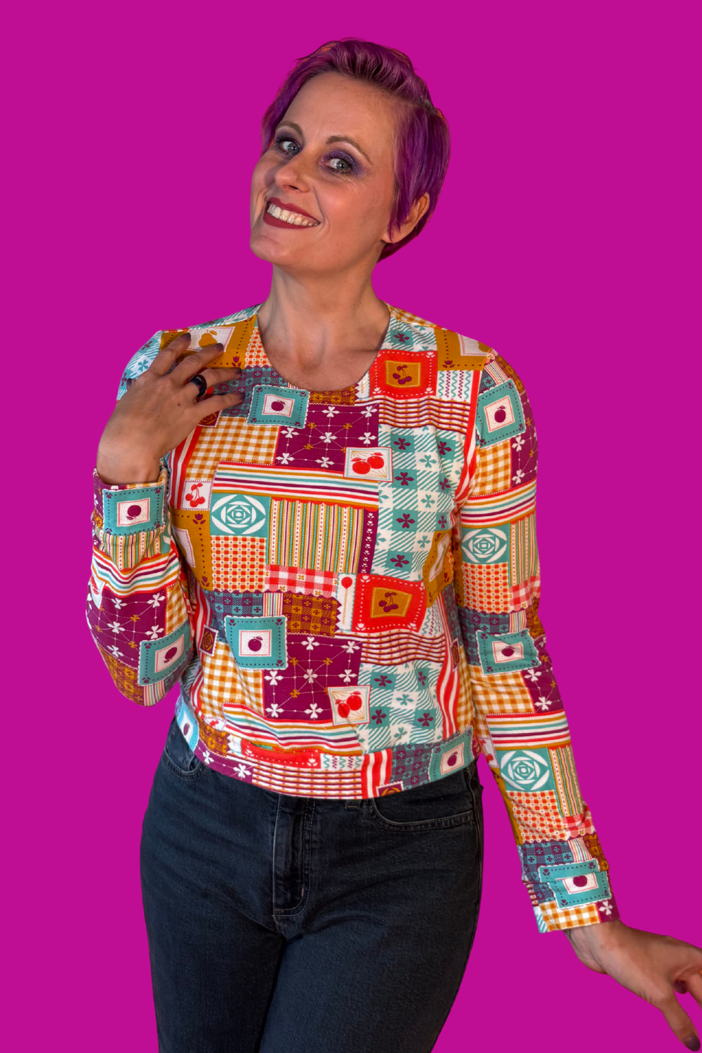 This gorgeous pullover features our original tablecloth- inspired print in ALL 9 SIZES in a soft, lightweight French terry fabric! This cropped top features our darling patchwork design is designed to be worn with high-waisted skirts, pants, jeans or shorts, so please read measurements.