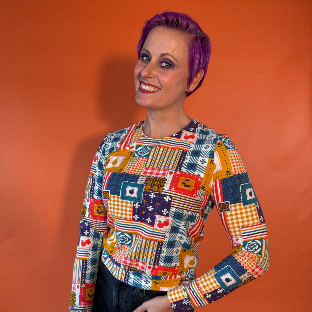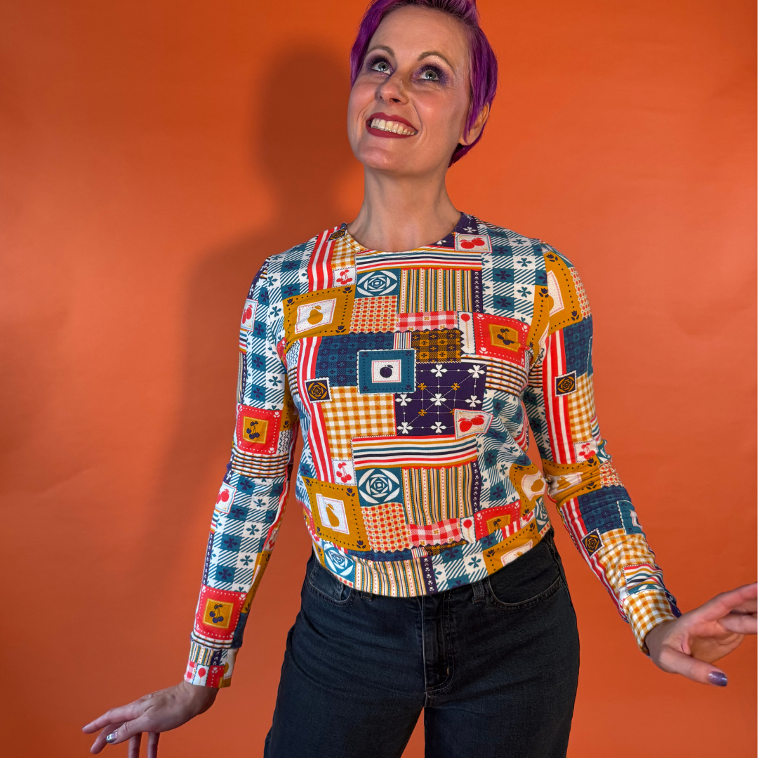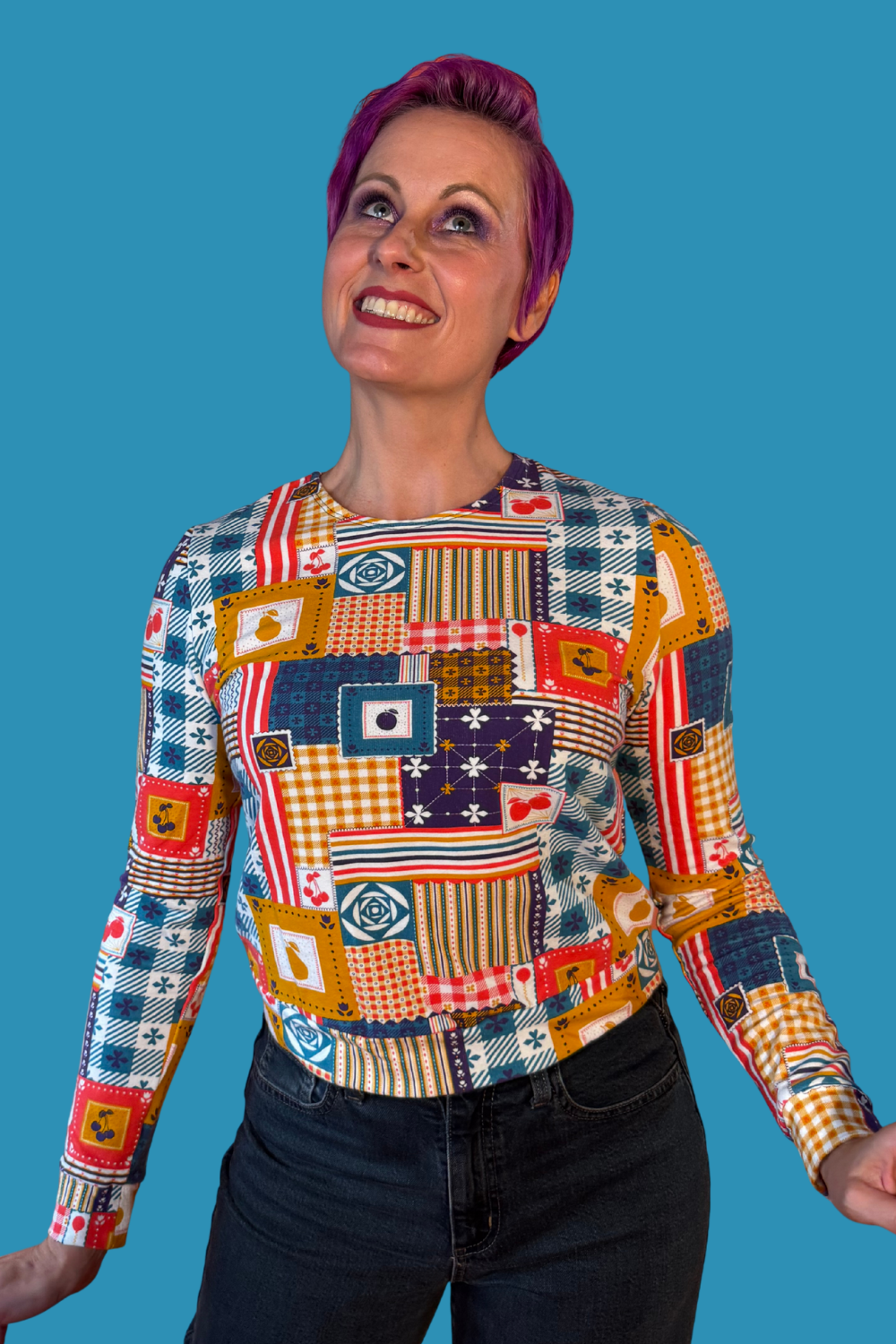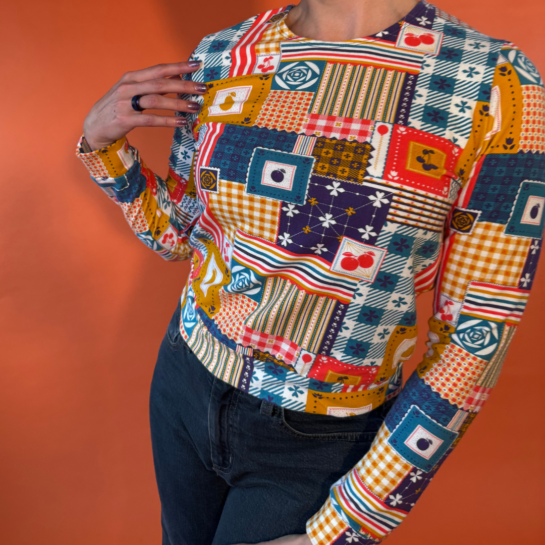 This gorgeous pullover features our original tablecloth- inspired print in ALL 9 SIZES in a soft, lightweight French terry fabric!  This cropped top featuring our darling patchwork design is designed to be worn with high-waisted skirts, pants, jeans or shorts, so please read measurements.